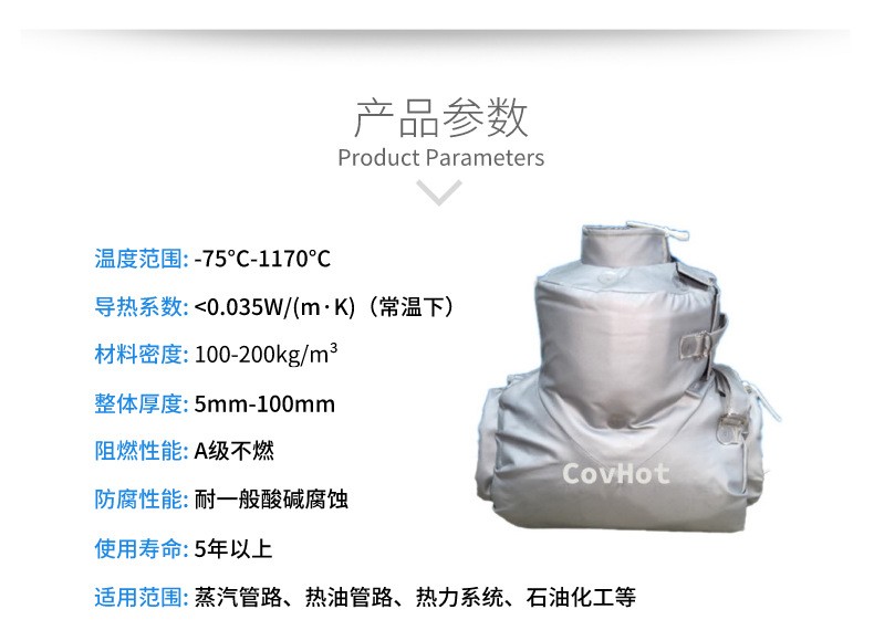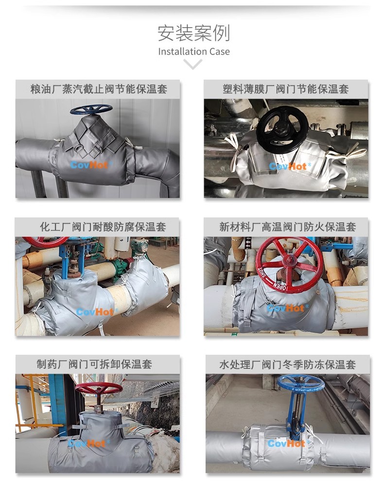 可拆卸截止阀保温套可以满足不同领域的柔性保温应用需求。可以很方便进行拆装操作,可重复多次使用,以最大化其经济效益,降低热损耗。对于一些表面形状特殊、复杂的设备隔热(防火),柔性隔热防火)套也能显示其独特的优势。经测试计算,采用本产品后,通常可节约热能达90%以上。有些用户短投资回收期仅为6个月左右。