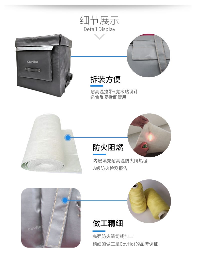 柔性防火罩特为所需保护的零件、执行器、阀门、储槽和管道的形状而专门设计和量身定做。可为控制器、阀杆、钢框架和按钮建立凹进处和孔洞;防火罩为特殊定制,可根据客户需求在所需位置开设穿过电源线的通孔,且在安装前可随时进行修改。防火罩外观可采用不同颜色织物制作,以便在系统不同区域内区分自动操作和方便操作人员在紧急状况下操作。